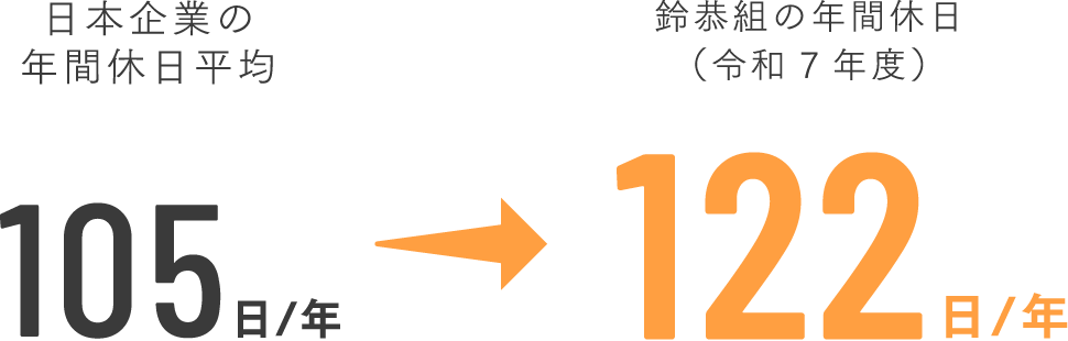 現在日本企業の年間休日の平均が105日と言われている中、鈴恭組では年間休日を確保しており、年末年始、GW等の連休も充実しています。